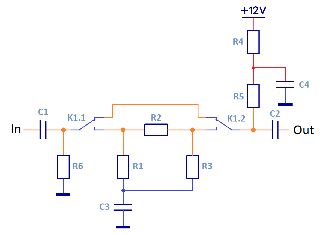 Arusaadav osa mulle oli C1 ja C2 (alalisvoolu läbivoolu tõkestamiseks erinevate skeemi astmete vahel), R1 - R3 (Pi - attenuaator signaali summutamiseks soovitud määra). Takistite R4 - R6 eesmärk aga jäi arusaamatuks. Vahet pole, kas attenuaatori osa on relee K1 abil ühendatud skeemi või mitte, mingi osa alalisvoolu jookseb lihtsalt vastu maad... miks?!