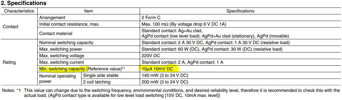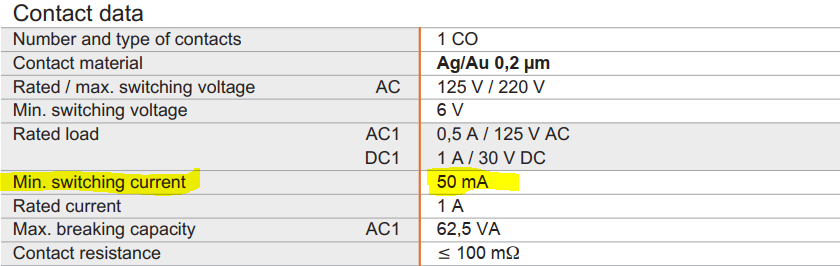 Vaatasin kohe oma projektides kasutatavaid signaali releesi ja avastasin suure ehmatusega, et kasutusel olevatel releedel on minimaalne kontakti vool 50mA.... ikka väga-väga-väga palju. Releed said kunagi valitud kompaktsete mõõtude, mähise madala tõmbevoolu, avatud kontaktide vahelise madala mahtuvuse ning maksumuse järgi.