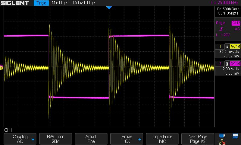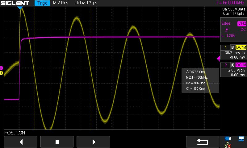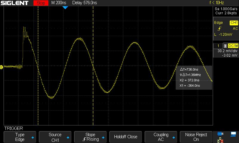 Kasutades kursoreid, mõõtsin tekkinud võnkumise sageduse. Selleks sain 1.36MHz. Mulle sobib. Kasutan pooli 500kHz signaali võimendis (RFC) ja minu rakenduses jääb see varuga pooli induktiivsele poolele.