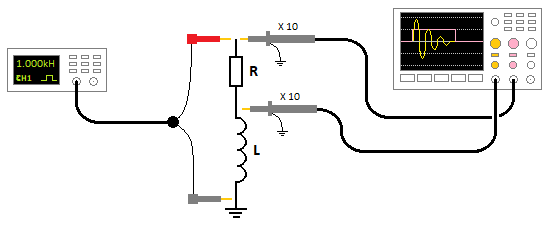Kuidas mõõta pooli omaresonantssagedust? See on üsna lihtne kui on ostsilloskoop ja signaali generaator käepärast. Esmalt ühenda testitav induktiivpool jadamisi 10MOhm takistiga. Pooli vaba ots ühenda generaatori ja ossi maanduse otsaga (korpus, miinus) ning takisti vaba ots ühenda generaatori signaali otsaga. Ostilloskoobi juhe ühenda takisti ja pooli ühenduskohta. Nii nagu all oleval joonisel.
