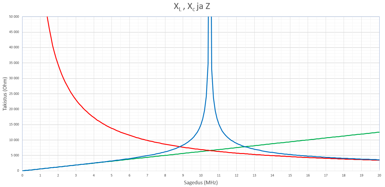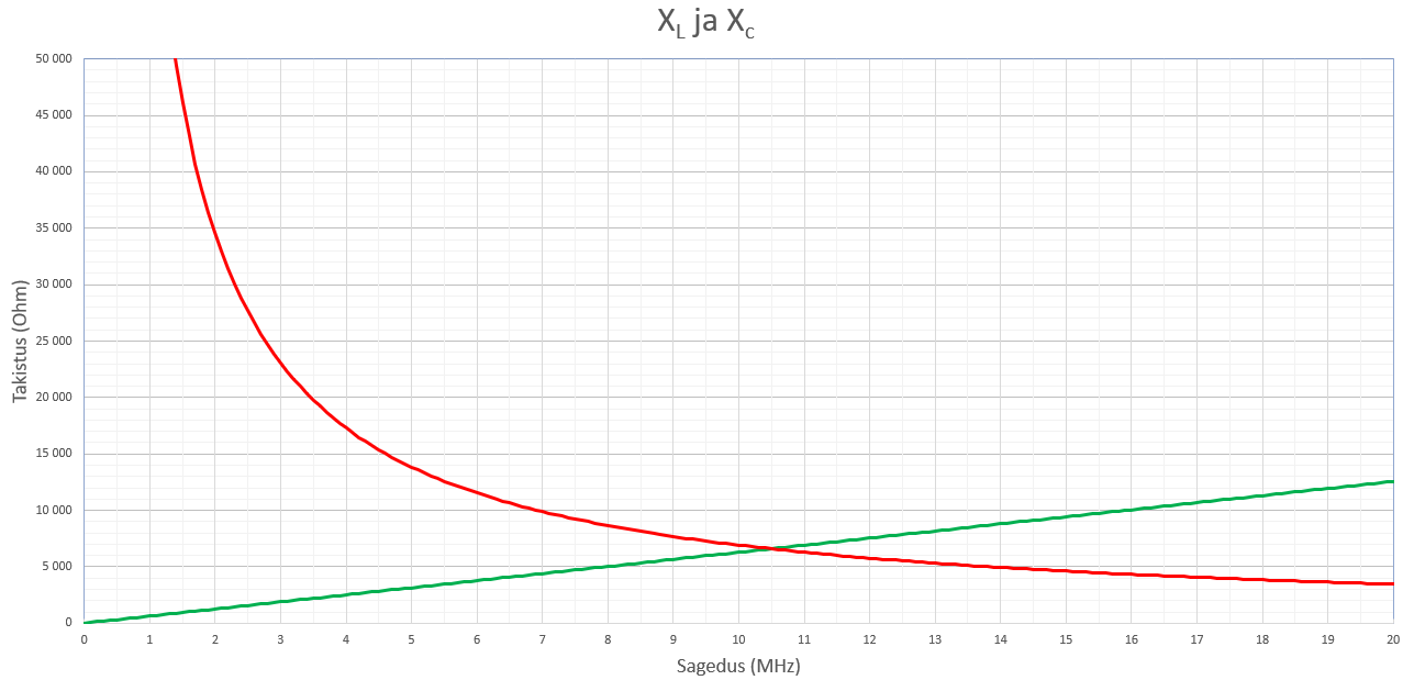 Graafiku roheline joon on pooli Induktiivtakistus (arvestamata aktiivtakistust R) ning punane on mahtuvuslik takistus