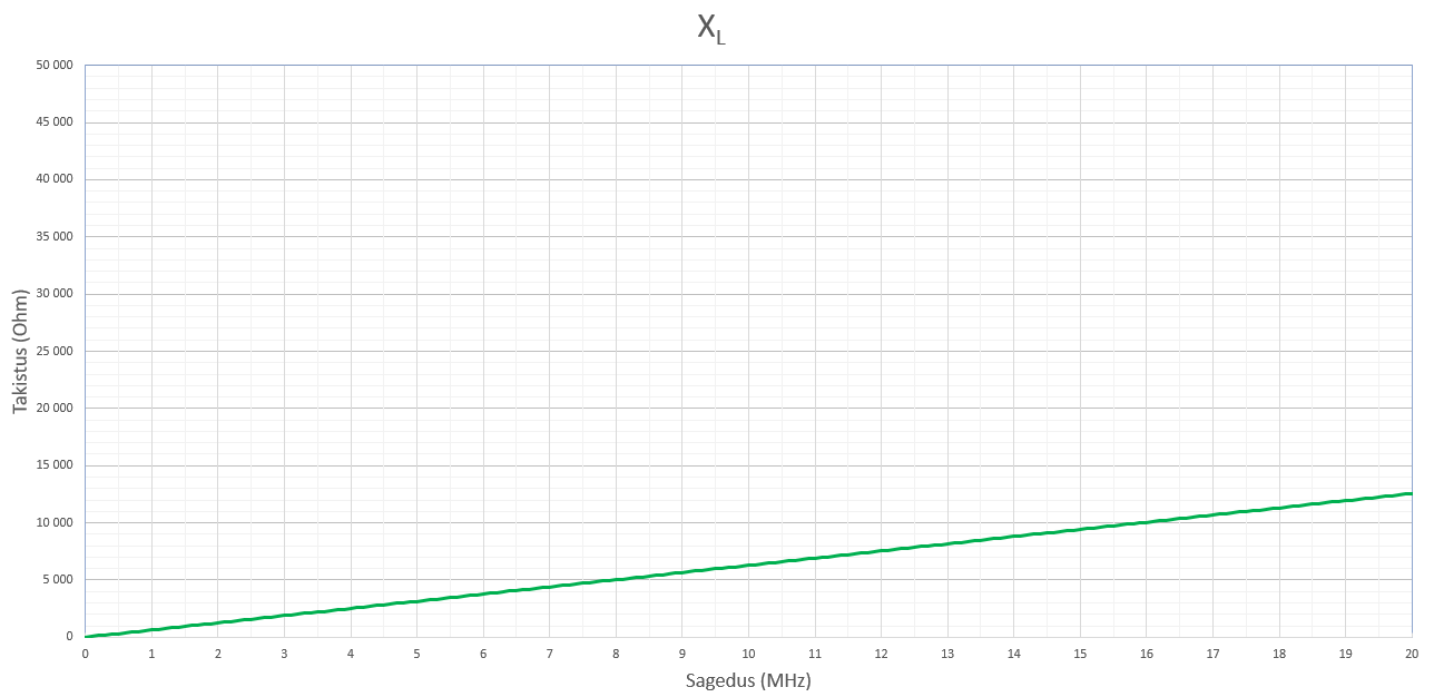 Nagu graafikult näha, on sageduse ja induktiivtakistuse suhe lineaarne ja sageduse muutumisel muutub meie pooli induktiivtakistus. 0MHz sagedusel on takistus praktiliselt null (pooli Z on võrdne pooli kerimiseks kasutatud traadi takistusega). 20MHz sagedusega vahelduvvoolule on aga takistus juba ca 13 kilo oomi. Päris suur muutus, kas pole?