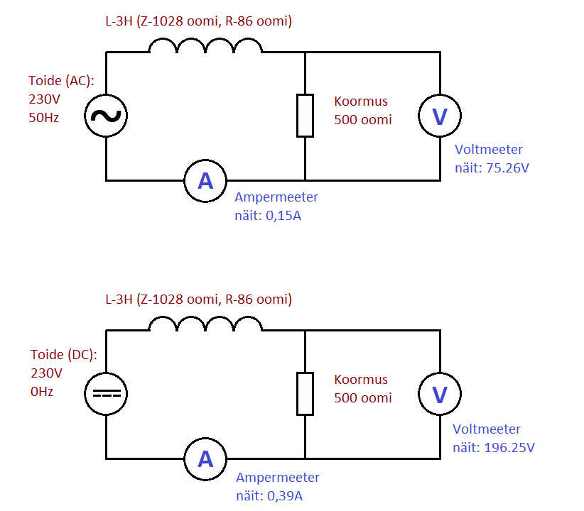 Skeem on lihtne pingejagur. Mõlemas skeemis on kõik komponendid samade nominaalidega. Samaks jääb ka toitepinge. Ainus, mida muudame on toitepinge sagedus. Esimesel skeemil toidame vooluringi 230V vahelduvvooluga ja teisel skeemil alalisvooluga. Usun, et pikemaid kommentaare pole vaja anda ja põhjused, miks on sellised erinevused voltmeetri ja ampermeetri näitudes oskate nüüd juba ise välja mõelda.