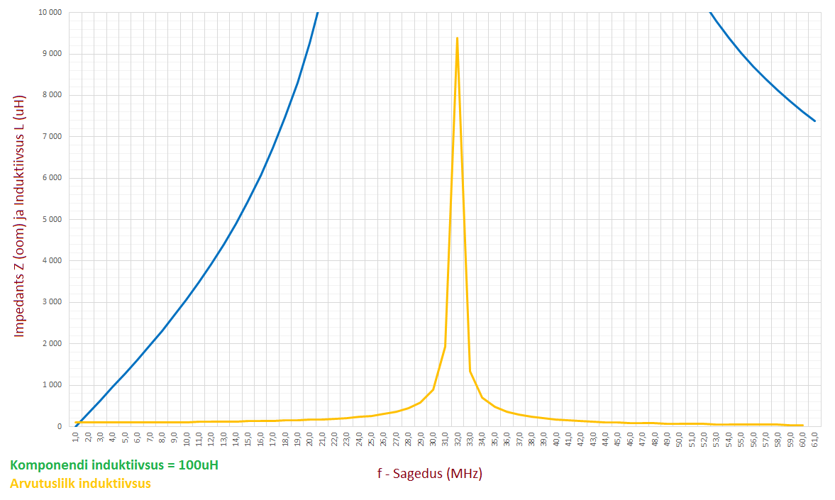 Nagu skeemilt näeme, tekib meil poolile paralleelne mahtuvus ja seda vastu meie enda tahtmist. See tähendab, et peame arvestama lisaks induktiivtakistusele ka mahtuvusliku takistusega. Paneme selle ka samale graafikule, kasutades samu lähteandmeid.
