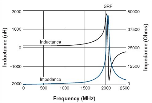 Antud 100uH induktiivsus toimib ettearvatavalt kuni 6MHz sageduseni. Edasi hakkab pooli induktiivtakistus järsult kasvama. Punktis, kus Xl ja Xc lõikuvad, sööstab pooli tegelik takistus Z raketina taevasse. Seda punkti nimetatakse pooli oma resonantssageduseks (SRF – Self Resonant Frequency). Sagedus, kus induktiivpool resoneerub ise enda mahtuvusega. Teadupärast LC paralleel võnkeringi takistus resonantssagedusel on lõpmatus.